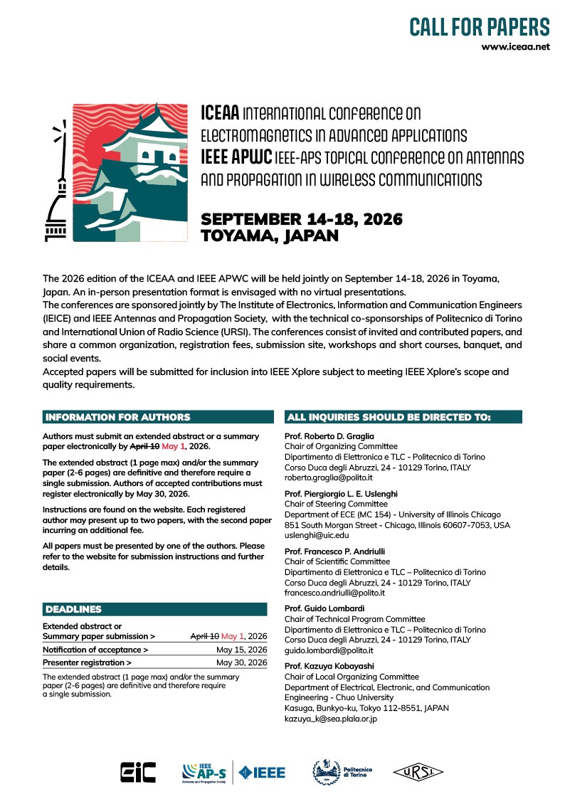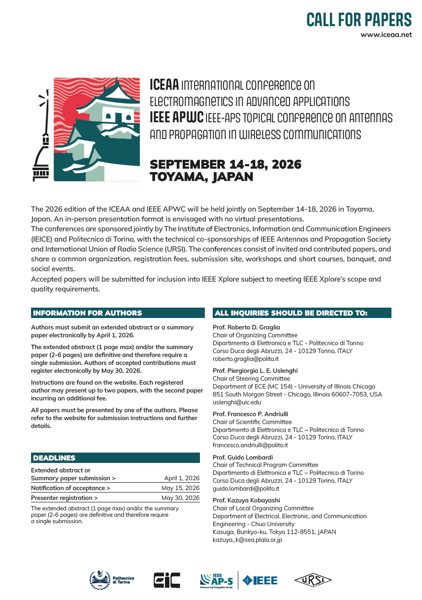 Full-text papers submitted to ICEAA ‘26 are copyrighted by IEICE. Full-text papers submitted to IEEE-APWC ‘26 are copyrighted by IEEE.